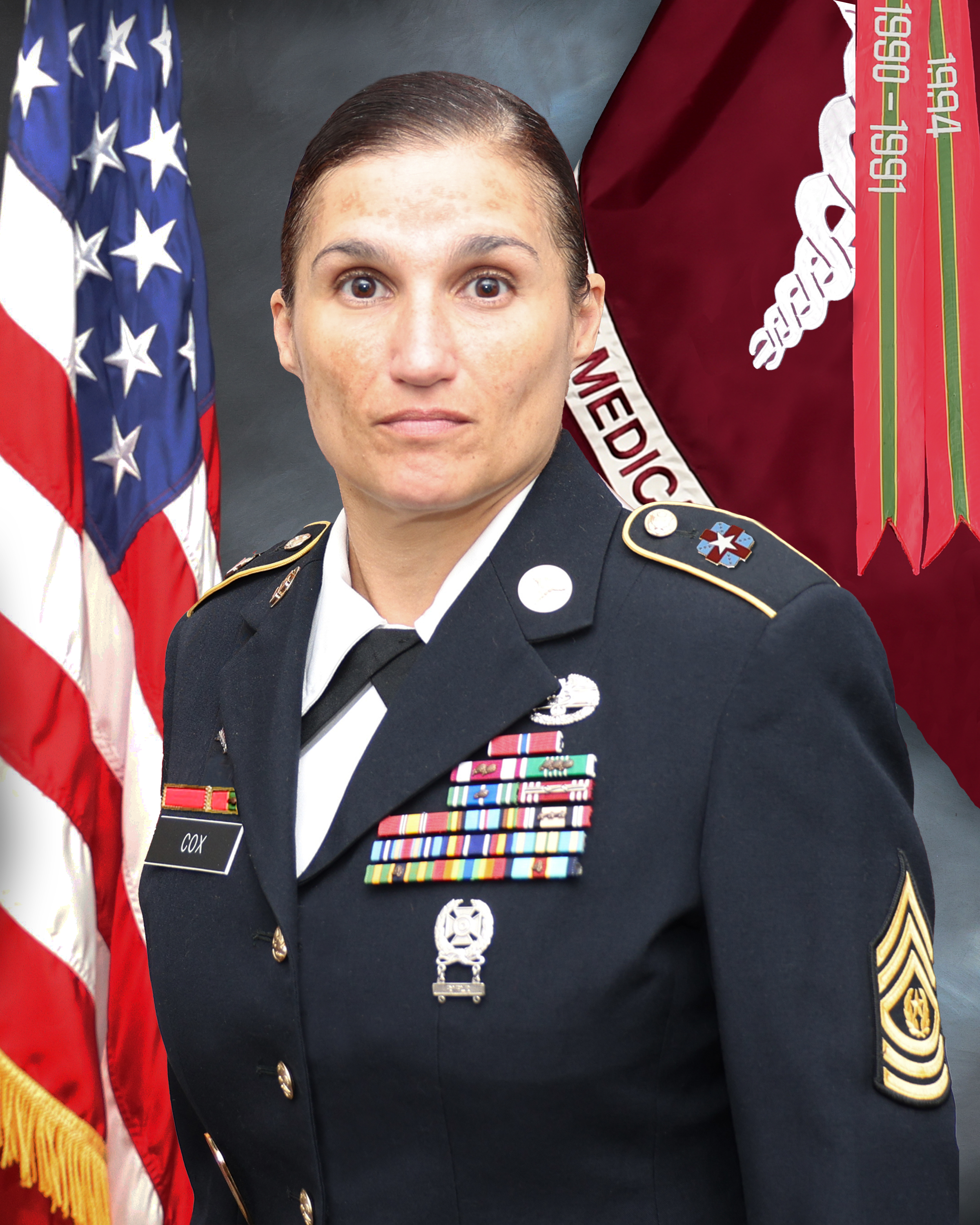 Command Sergeant Major Angela M. Cox is a native of Garfield, New Jersey; she entered the Army in November of 1997, went to Basic Training at Fort Jackson, North Carolina and AIT at Fort Sam Houston, San Antonio, Texas where she was awarded the MOS 68W Healthcare Specialist.